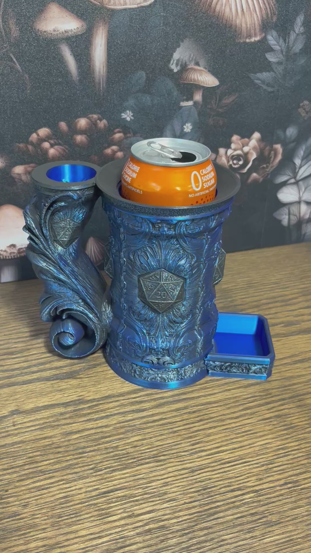 Tankards/dice vaults are printed with PLA/PLA Silk and painted with Fusion Mineral Paint. They have a light polycrylic top coat. These are not food safe, are intended for indoor use only and should not be exposed to extreme heat or be fully immersed in water. Please wipe clean with a damp cloth only.